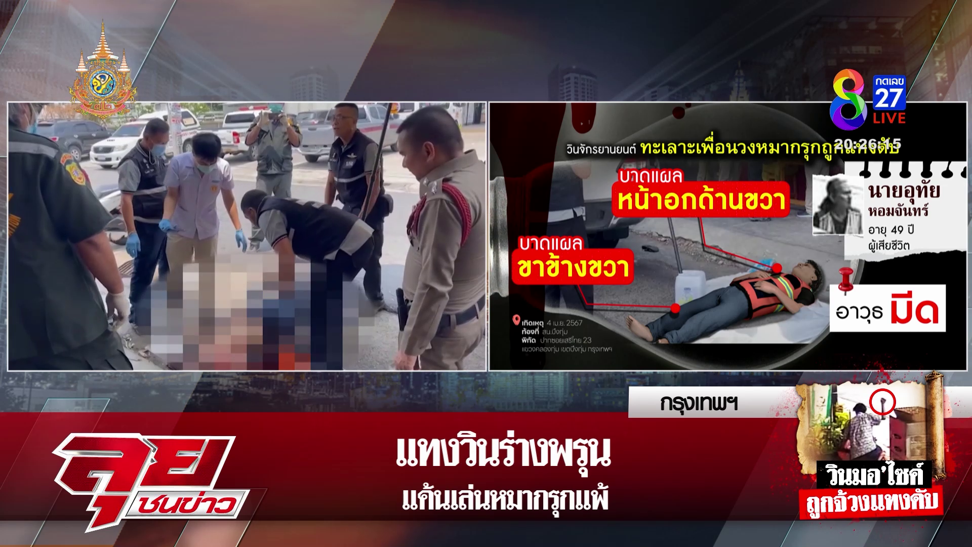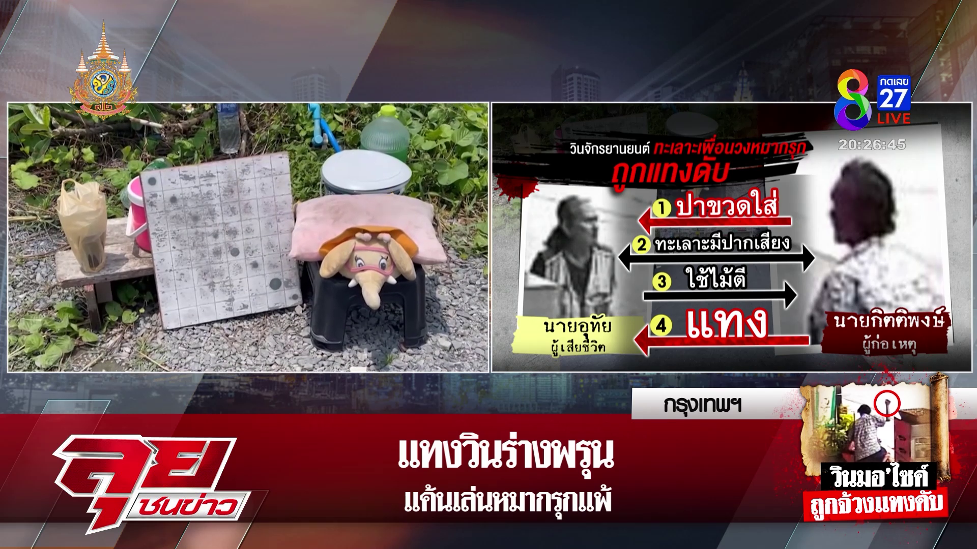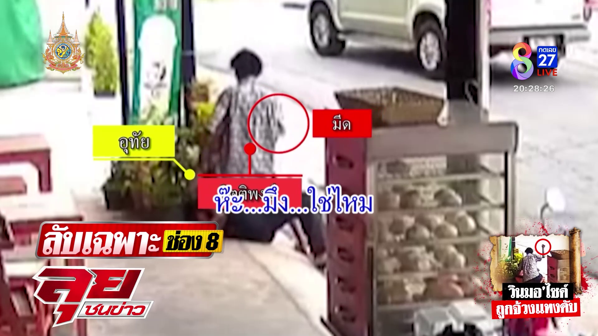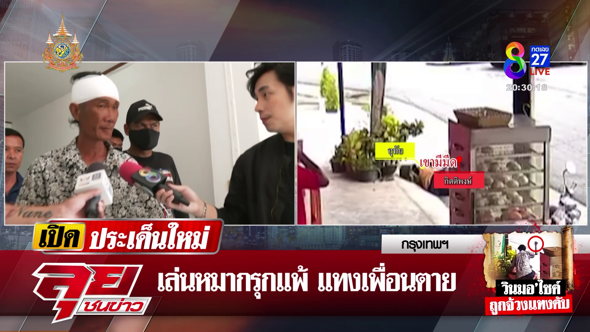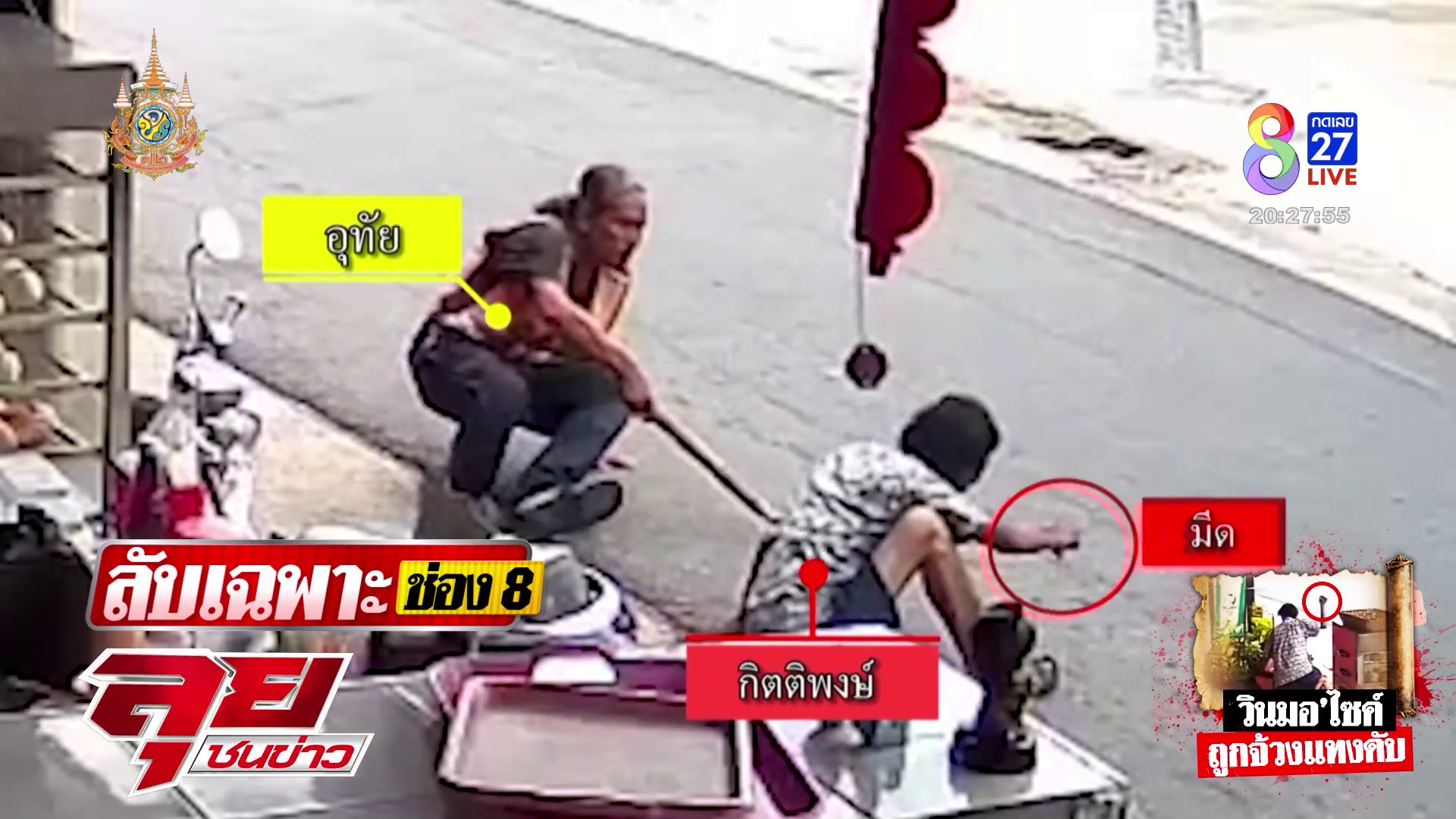事发时,闭路电视摄像机捕捉到了图像。今天的照片中,这对夫妇发生了争吵,4 月 4 日,上午 10 点 02 分,闭路电视捕捉到了 Uthai 先生的画面。身穿机车夹克、握着木手的 Kittiphong 先生身穿白色条纹衬衫和短裤,右手握着一把刀。正在战斗的战前特点挣扎在看到Uthai先生试图用棍子打Kittipong先生之前并且会有一段时间,人们相信死者的右胸被刺伤。在相机角度结束时崩溃之前